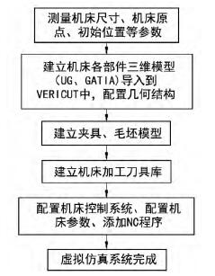 根據(jù)機(jī)床的結(jié)構(gòu)及尺寸,在 VERICUT 中建立虛擬機(jī)床模型。 其主要過(guò)程如圖 1 所示。